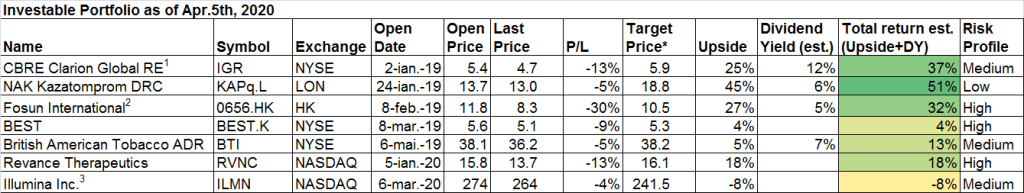 In terms of changes to the portfolio I added back Illumina (ILMN) @$274/share and doubled down the exposure on CBRE Clarion Global Real Estate (IGR) @$4.8/share.