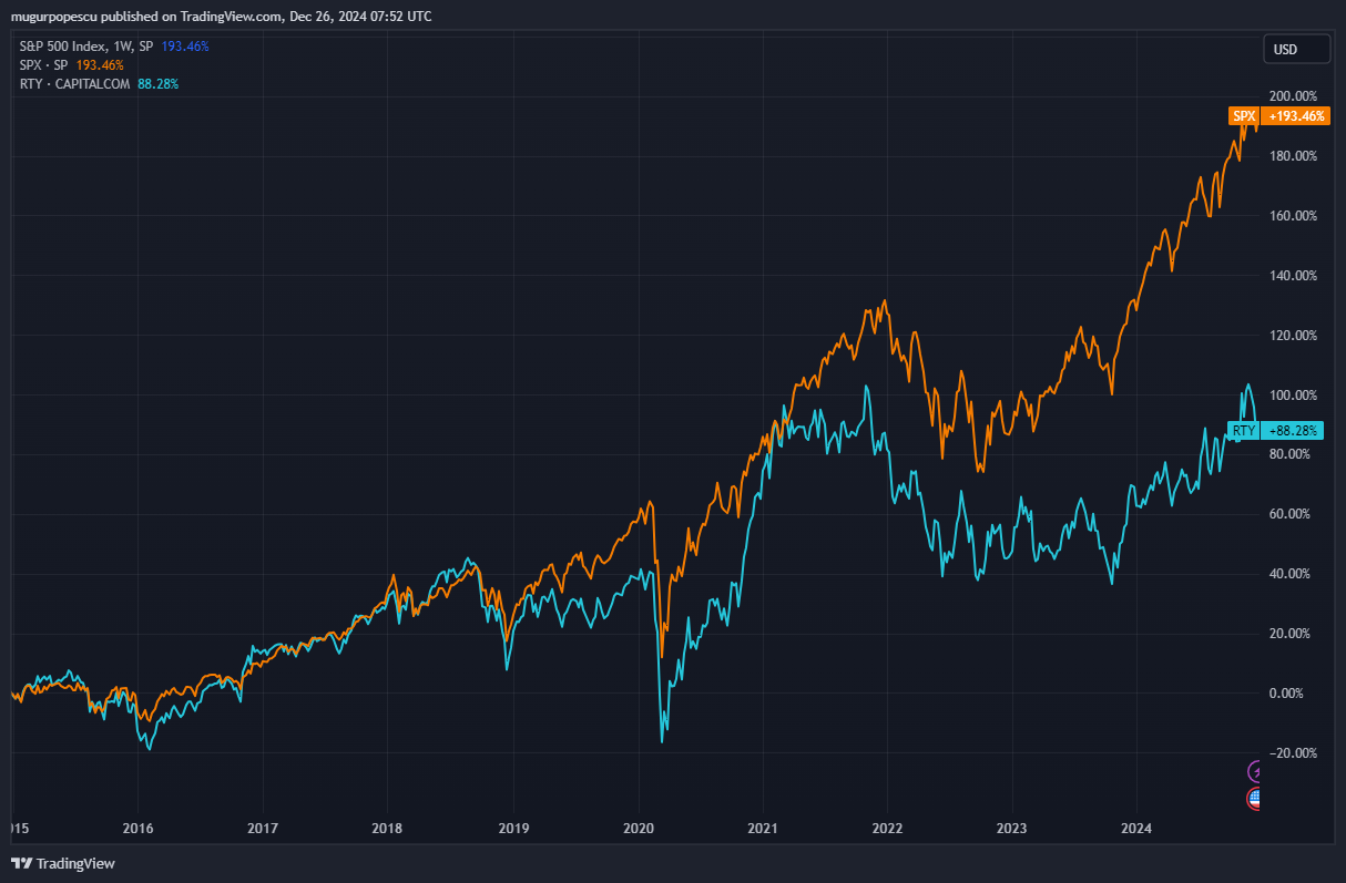 Historically, small-cap stocks have often outperformed their large-cap counterparts due to their greater growth potential and inefficiencies in pricing. Nevertheless, the situation has been dramatically different over the last decade. The S&P 500 Index has outperformed the Russell 2000 Index by about 52% over the last 5 years. It has outperformed even by over 100% over the last 10 years. I suspect this trend is about to reverse as the difference in financial performance does not justify it.