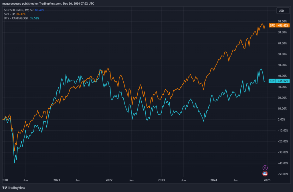 The price-to-earnings (P/E) ratio for the Russell 2000 Index is currently 27, while the P/E ratio for S&P 500 is 30.5.